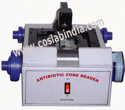 The antibiotic zone reader provides a rapid accurate method for determining the strength of antibiotic materials by measuring the diameter of an inhibited zone in Petri dish to 0.02mm., with the range of 0 to 35mm. Works on 220V/50Hz AC.
